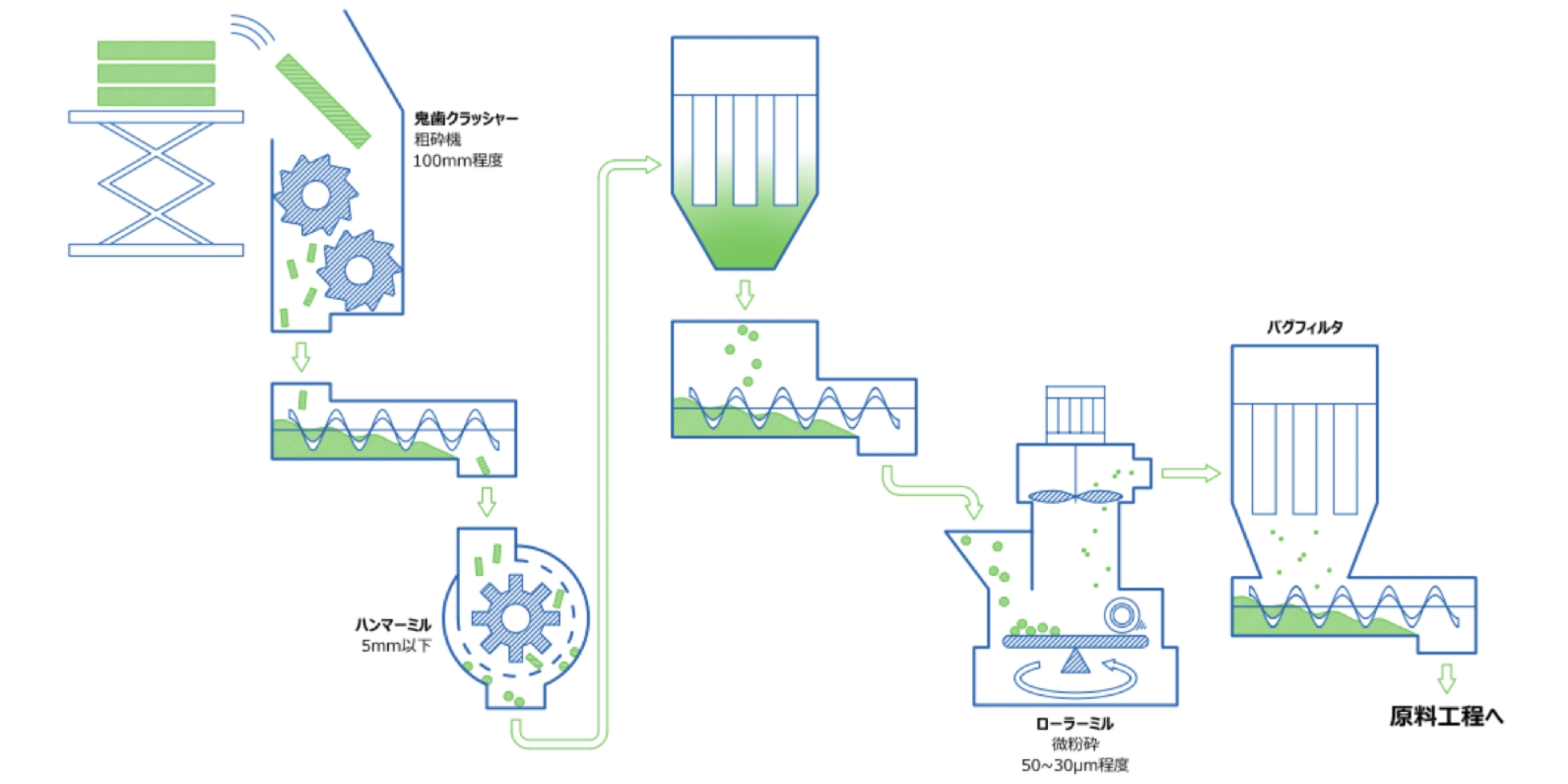窯業系サイディングボードの端材を粉砕を行い、リサイクル原料として使用できるように分級まで行っている設備