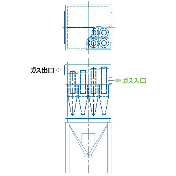 - サイクロン単体を多数設置し、大風量処理が可能 (マルチサイクロン)