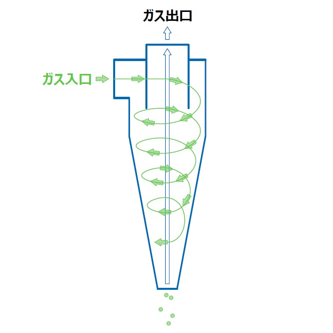 含塵ガスを円筒内で旋回させ、遠心力によって粉塵を外壁側に移動させて分離します。