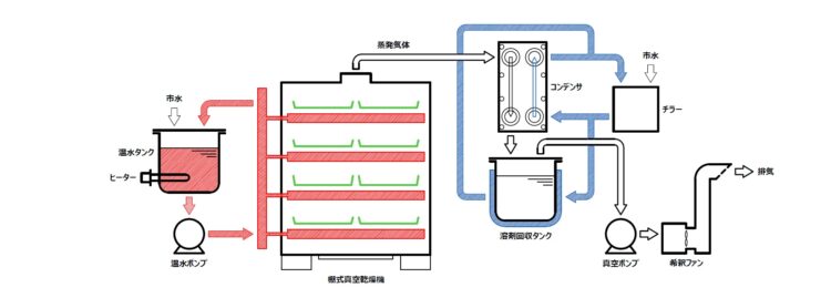 棚式乾燥機における原料真空乾燥及び排気中に含まれる溶剤回収