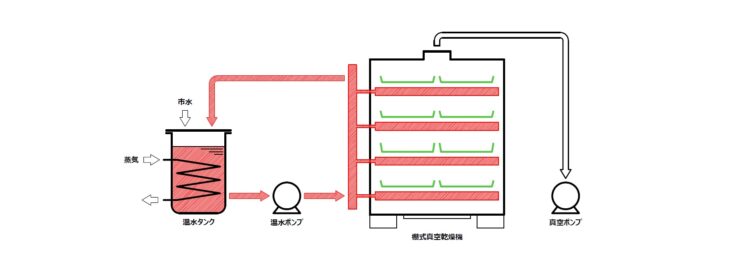 - 温水タンクより温水を乾燥機棚段へ供給し、原料を加熱します。