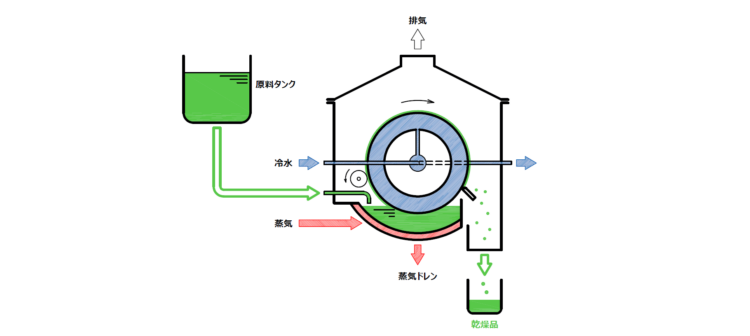 - ドラムに付着した原料はドラムが1回転する間にドラムと熱交換することで固形化します。