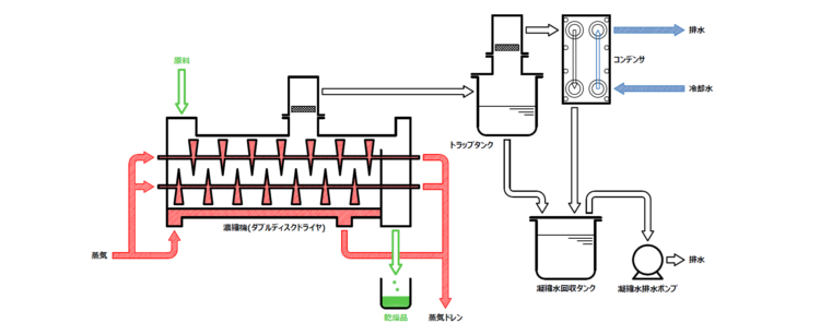 - 蒸気ボイラーより飽和蒸気を濃縮機ジャケット及びディスク羽根へ供給し、原料を加熱します。